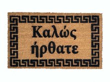"Happy House" in English. THIN mats are woven & intended for indoor use, not recommended for heavy service. Keep your Damn Good Doormat in a sheltered area away from sun & rain!!!